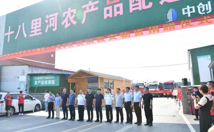 7月26日上午,鄭州市市場發展中心聯合十八里河農產品配送中心和中歐商學院舉行賑災物資捐贈儀式,向我市各地受災嚴重地區捐贈礦泉水、牛奶、面包、方便面等應急生活物資。